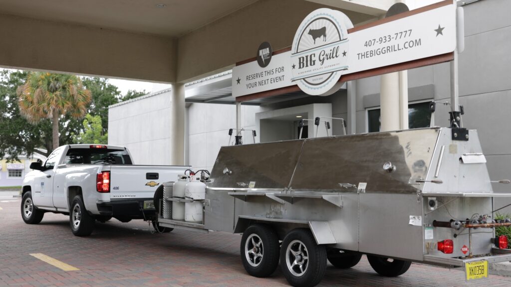 The Big Grill is a trailer-mounted barbecue unit featuring 40 square feet of cooking surface and powered by twin 40-pound propane tanks.